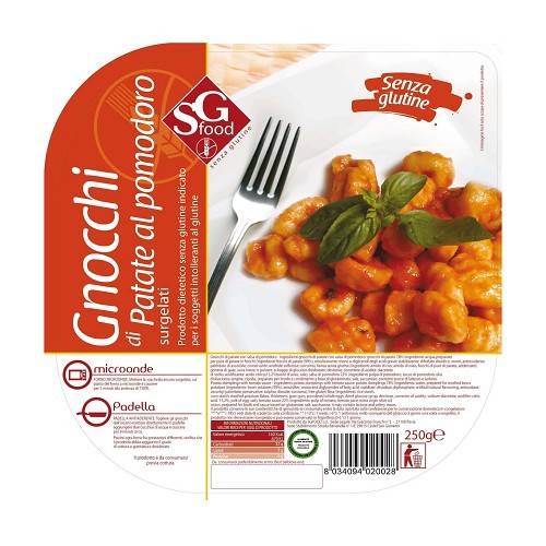 Gnocchi di patate (acqua; preparato per purè di patate in fiocchi; fiocchi di patate. Emulsionante: monogliceridi degli acidi grassi; digliceridi degli acidi grassi. Stabilizzante: difosfato disodico. Aromi. Antiossidante: palmitato di ascorbile. Conservante: anidride solforosa; curcuma; farina senza glutine; tuorlo d’uovo; sale); salsa di pomodoro (polpa di pomodoro; olio extravergine d’oliva; cipolla; preparato per brodo; condimento a base di glutammato; sale; saccarosio.
