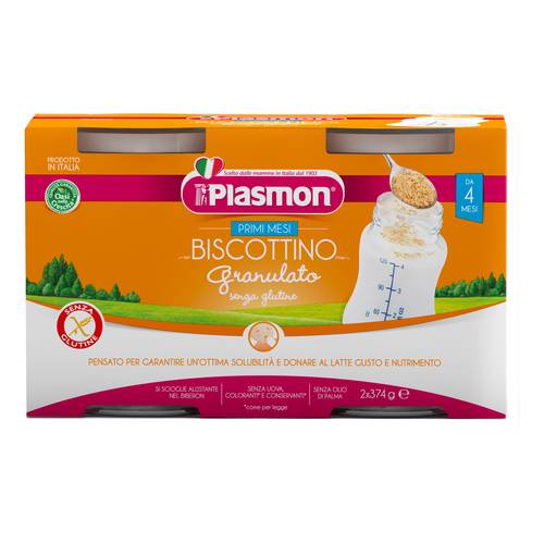 Plasmon Primi Mesi BISCOTTINO GRANULATO Biscottino granulato solubile. Preparato con farina 100% di riso, senza burro, senza uova. Finemente macinato, si dissolve fino all’ultimo granello e passa perfettamente dalla tettarella. Facile da dosare. Arricchito con calcio, ferro e vitamine. Dal 4°/6° mese, salvo diversa indicazione del Pediatra.