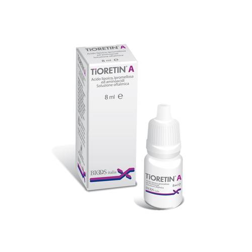 L'ipromellosa è un polimero con caratteristiche mucomimetiche che ha la proprietà di ripristinare e stabilizzare il film lacrimale sulla superficie oculare creando uno scudo protettivo, trasparente e viscoelastico. Gli aminoacidi L-prolina, L-glicina, L-lisina cloridrato e L-leucina, contenuti nel prodotto aumentano la lubrificazione della superficie oculare e possono contribuire al miglioramento della protezione degli epiteli sottoposti a stress di varia natura. L'idrossimetilglicinato di sodio (N-IG), contenuto nel Tioretin A, è un derivato aminoacidico che grazie alla sua attività antimicrobica esercita un'efficace azione conservante ed è privo di effetti negativi sulla superficie oculare. Indicato per stabilizzare e reintegrare il film lacrimale nei casi di alterazioni istologiche corneo-congiuntivali causate da strati di sbilanciamento del potenziale ossido-riduttivo cellulare, e accumulo di radicali liberi a carico della superficie oculare. In particolare il prodotto è utile in condizioni di particolare stress ossidativo: