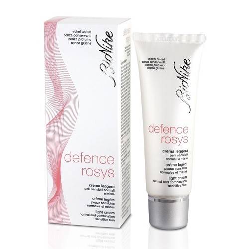 BioNike DEFENCE ROSYS CREMA LEGGERA Emulsione leggera per pelli normali e miste, che previene e attenua i rossori, diffusi o localizzati, tipici della pelle a tendenza couperosica. Aiuta a ridurre la fragilità capillare, idrata e protegge la pelle migliorandone l’elasticità. Con polisaccaridi marini da alghe atlantiche, troxerutina, peptide biomimetico e acido 18β-glicirretico, β-glucano/L-carnosina, acido ialuronico e olio di jojoba. Prodotto altamente tollerabile, senza glutine, profumo e conservanti; testato per il nichel.