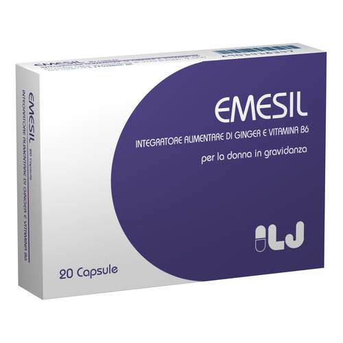 Emesil Integratore alimentare a base di estratto secco di zingiber officinale (zenzero), titolato al 5% in gingeroli e vitamina B6 indicato per i disturbi neurovegetativi tipici della gravidanza quali nausea e vomito.