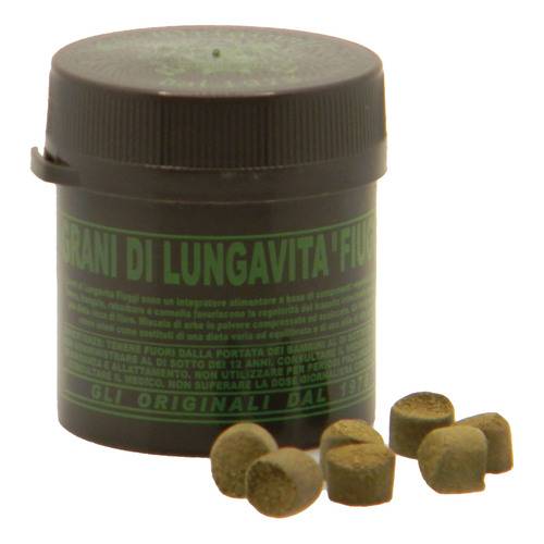 Grani di Lungavita Fiuggi Integratore alimentare a base di componenti vegetali selezionati. Senna, frangula, aloe, rabarbaro e cannella favoriscono la regolarità del transito intestinale associati ad una dieta ricca di fibre. Miscela di erbe in polvere compressate ed essiccate.